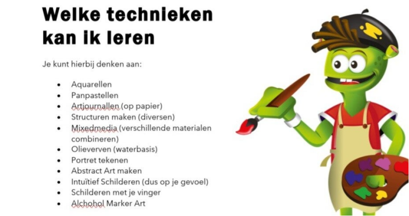 Lijkt het jouw leuk om diverse technieken uit de kunstwereld te proberen? Dan heb ik een leuk nieuwsbericht voor je. Vanaf Januari 2023 ga ik 1x per maand een onderwerp uitleggen op zaterdagmorgen van 10:00 tot 12:00 uur. Kijk gauw op deze pagina voor meer info. Wie weet zien we elkaar snel in het Atelier.